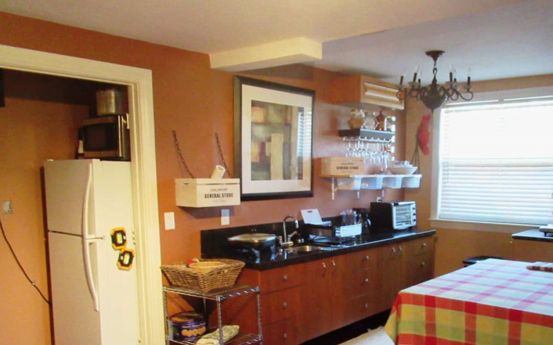 Unit has complete kitchen including induction stovetop, full size refrigerator, toaster oven, coffee maker etc.